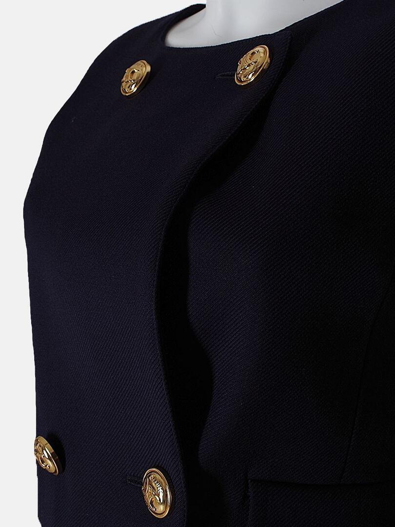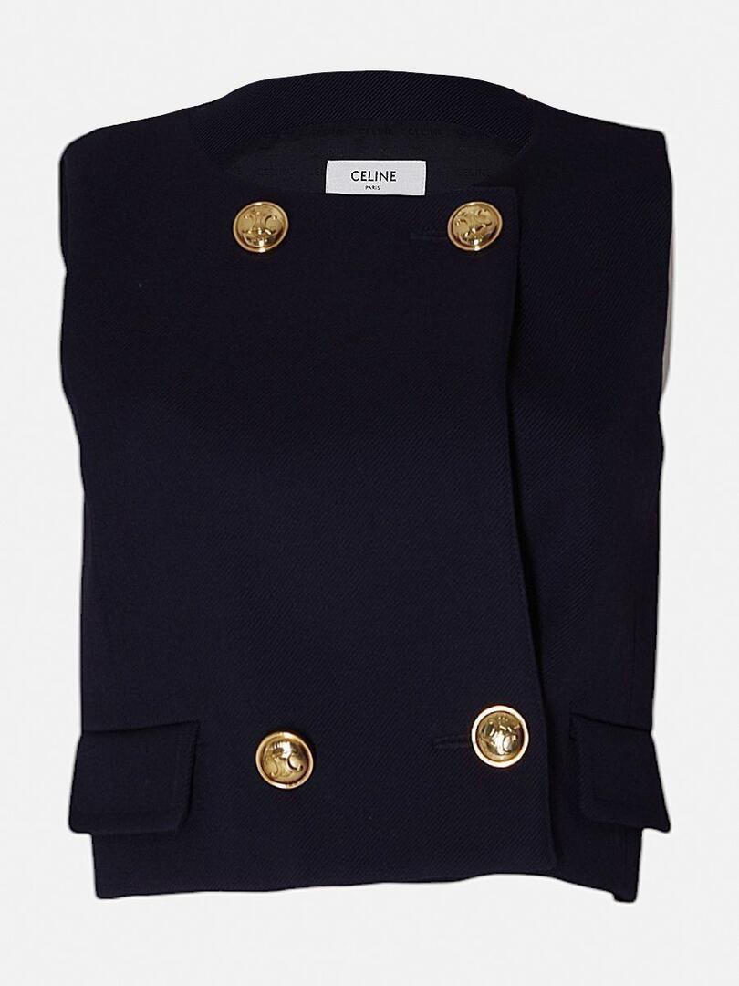 Жилетка Celine выполнена из плотной ткани тёмно-синего цвета с фактурой, подчёркивающей качество пошива; модель украшена крупными золотистыми кнопками с логотипом бренда и дополнена двумя накладными карманами, сочетая строгий силуэт и элегантные детали — идеальный элемент делового или вечернего образа. Ткань: 99% шерсть 1% шелк Подкладка: 51% модал 49% вискоза Погрузитесь в мир утончённого минимализма с коллекциями Celine. Каждое изделие бренда отражает сочетание элегантности и функциональности, подчёркивая индивидуальность своего владельца. Будь то культовая сумка Trapeze, стильный жакет или аксессуар, продукция Celine станет неотъемлемой частью вашего гардероба, сочетая высокое качество и современный дизайн.