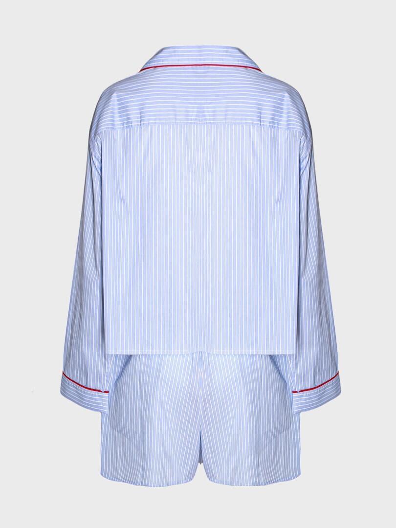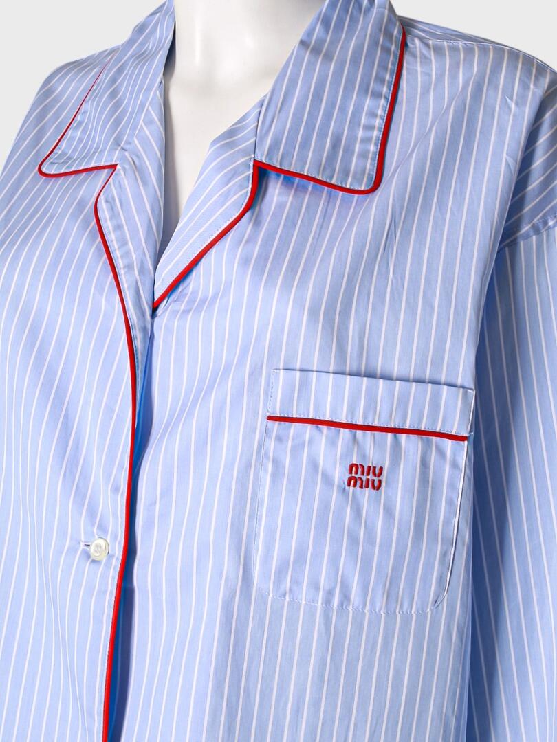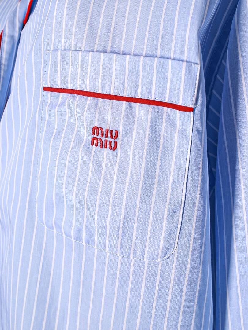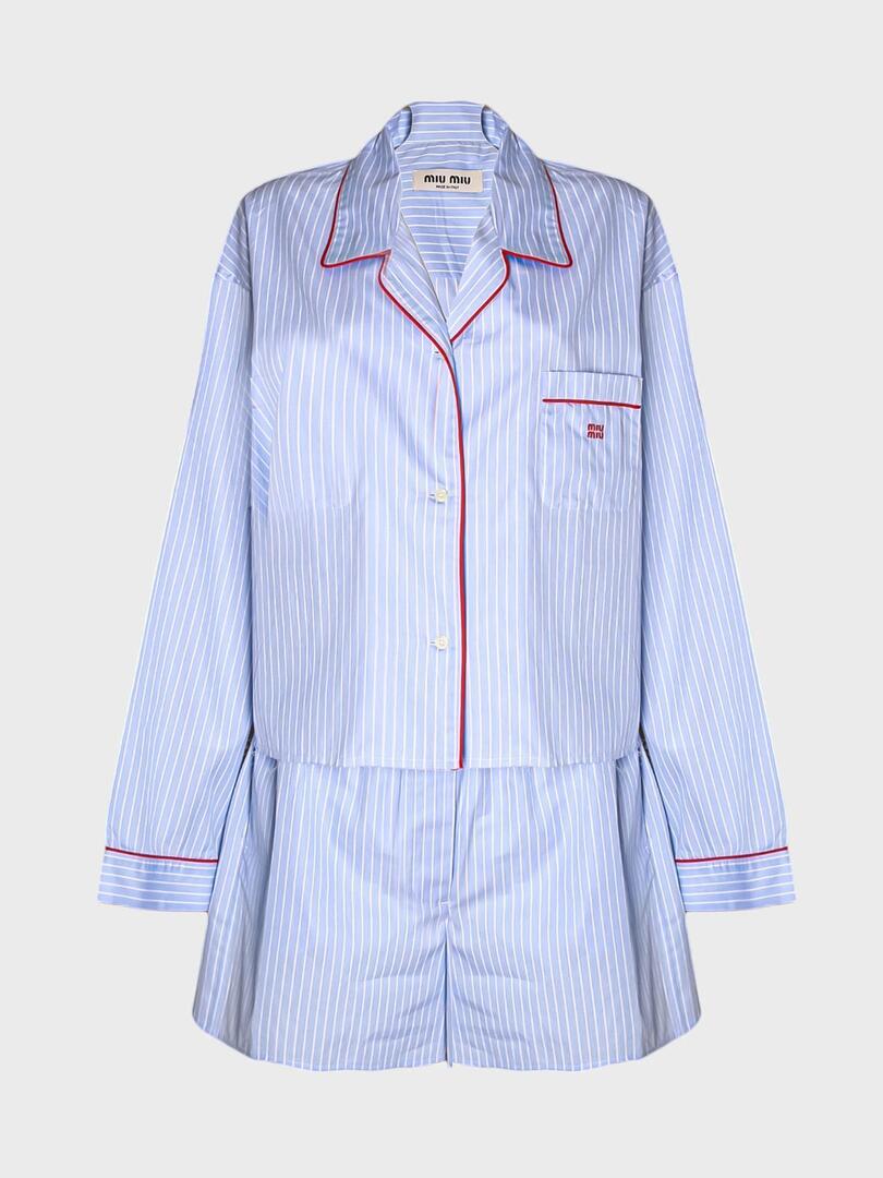 Элегантный комплект из рубашки и шорт от итальянского бренда Miu Miu, выполненный в классическом стиле с современным акцентом. Комплект изготовлен из тонкой хлопковой ткани с вертикальными полосами светло-голубого цвета, что придает ему легкость и свежесть. Особое внимание уделено деталям: контрастные красные строчки на манжетах, карманах и воротнике создают эффектный акцент, подчеркивающий роскошь дизайна. На груди рубашки расположен небольшой вышитый логотип Miu Miu, добавляющий узнаваемости бренда. Шорты прямого кроя с высокой посадкой идеально сочетаются с рубашкой, обеспечивая комфортную посадку и стильный внешний вид. Этот комплект — отличное решение для повседневного использования или летних мероприятий, где требуется безупречный вкус и качество. 100% хлопок Погрузитесь в мир смелого и игривого стиля с коллекциями Miu Miu. Каждое изделие бренда — это сочетание элегантности и дерзости, отражающее современную женственность. Будь то мини-юбка, балетные туфли или стильная сумка, продукция Miu Miu подчеркнёт вашу индивидуальность и создаст неповторимый образ. Смело сочетайте классику с авангардом и будьте в центре внимания с Miu Miu.