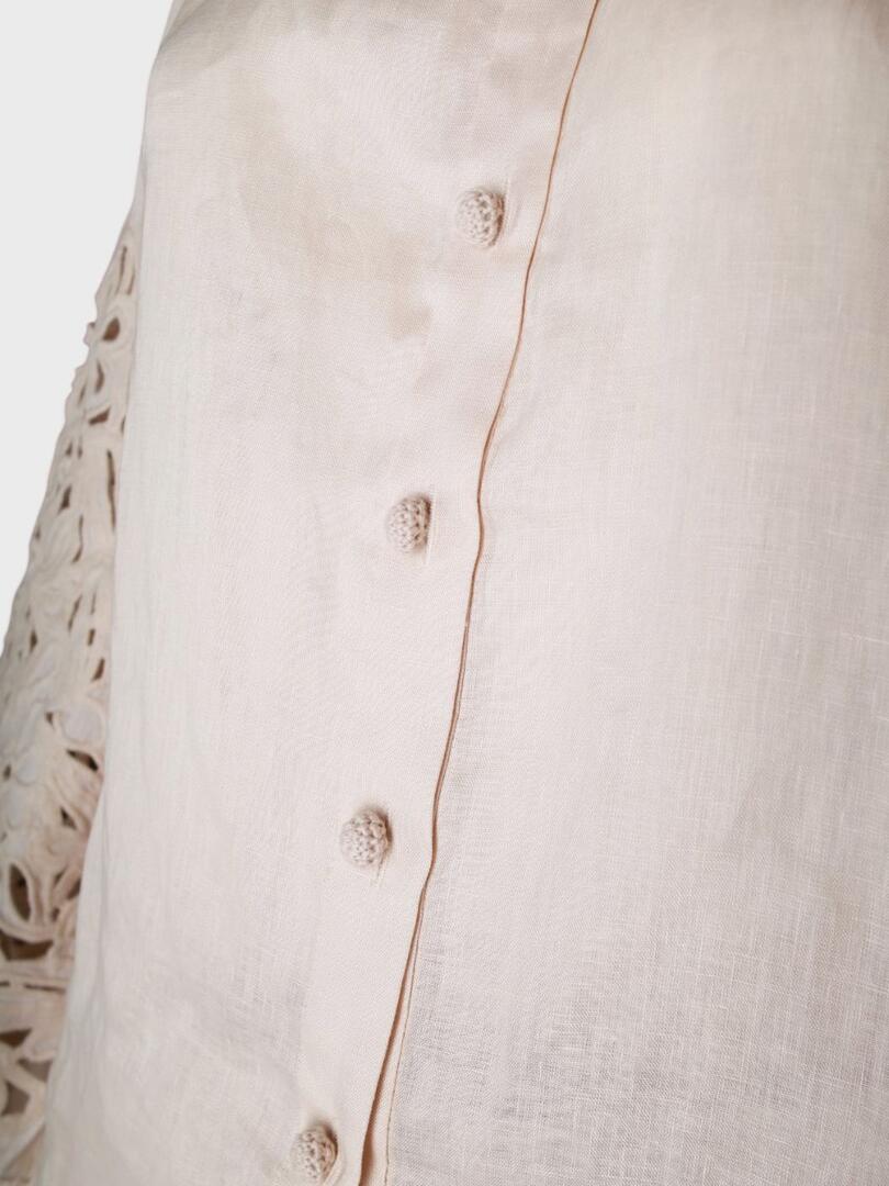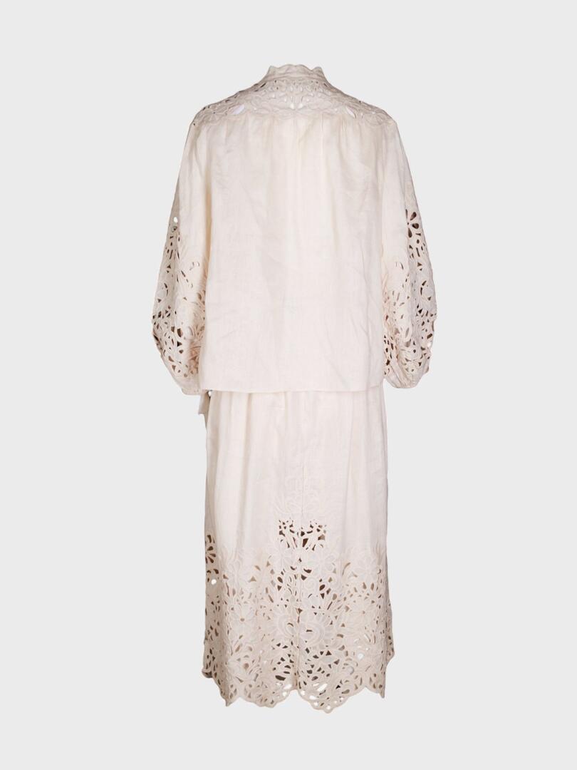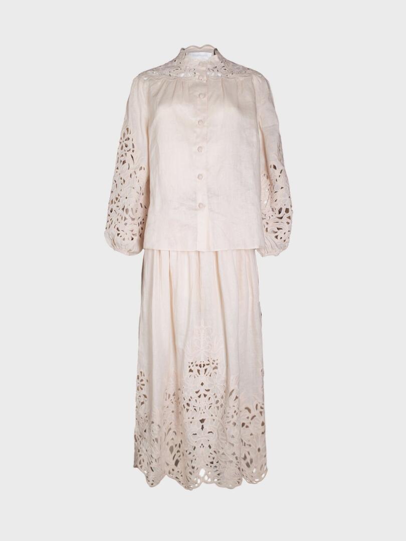 Костюм Zimmermann представляет собой элегантное платье-рубашку из легкой ткани нейтрального оттенка с вышивкой в технике батик. Модель с высоким воротником, пуговицами спереди и объемными рукавами, украшенными узором, сочетает романтичность и утонченность. Плиссированная юбка и кожаный пояс подчеркивают женственность и качество исполнения — идеальный выбор для летних образов в духе австралийской роскоши. 100% лен Откройте для себя мир элегантности и утончённости с коллекциями Zimmermann. Каждое изделие бренда — это воплощение женственности и стиля. Изысканные ткани, романтичные принты и идеальная посадка делают вещи Zimmermann идеальными для тех, кто ценит красоту и комфорт. Будь то летний комплект, вечернее платье или стильный купальник — продукция Zimmermann подчеркнёт вашу индивидуальность и создаст неповторимый образ на любой случай.