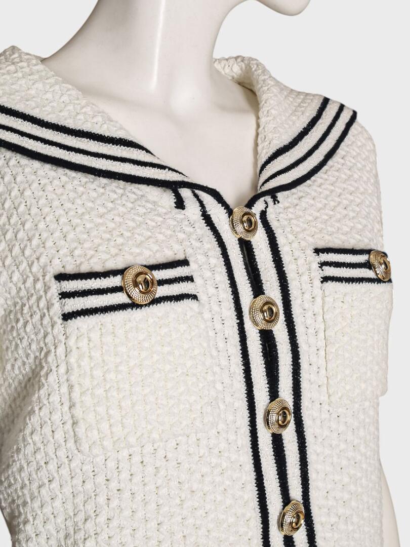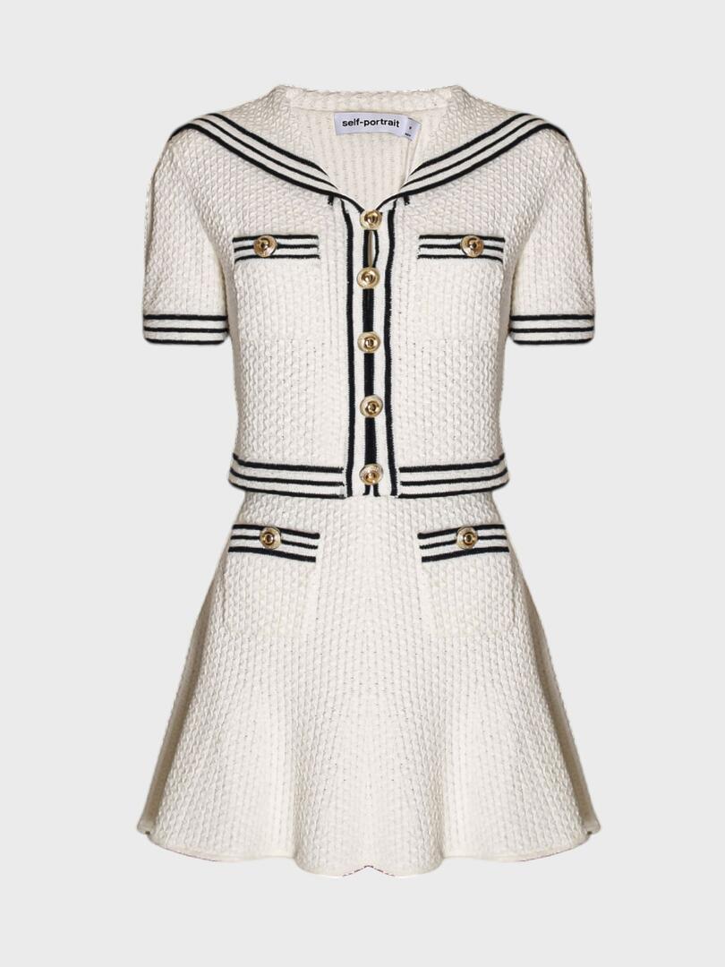 Костюм Self-Portrait выполнен из фактурного белого твида с черными контрастными полосами, вдохновленным морским стилем. Модель состоит из приталенного жакета с короткими рукавами и декоративными золотыми пуговицами, а также юбки-футляр с легкой складчатостью. Прямой силуэт и акценты на талии создают эффектный образ, идеально подходящий для деловых встреч или особых мероприятий. Основа: 55% хлопок 24% полиэстер 21% полиамид Воротник: 50% хлопок 32% полиэстер 18% полиамид Погрузитесь в мир утончённой женственности с коллекциями Self-Portrait. Каждое изделие бренда — это сочетание элегантного дизайна и современной эстетики, подчёркивающее индивидуальность и уверенность женщины. Будь то культовая кружевная платье, стильный жакет или изысканный аксессуар, продукция Self-Portrait станет неотъемлемой частью вашего гардероба, сочетая высокое качество и современный стиль.