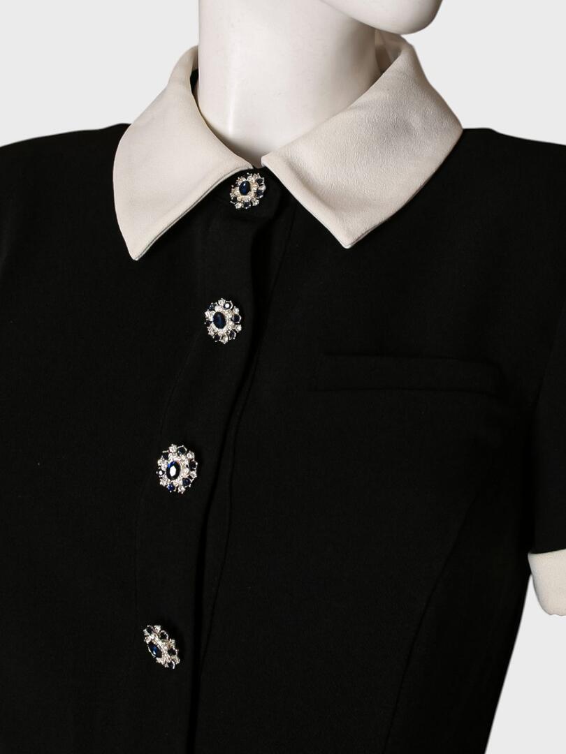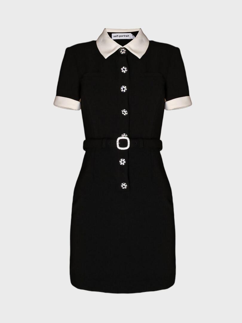 Платье Self-Portrait выполнено из черной ткани с белыми вставками, создавая контрастный и элегантный образ. Модель прямого кроя с короткими рукавами и V-образным вырезом подчеркивает фигуру благодаря облегающему силуэту. Особое внимание привлекают декоративные элементы — пуговицы с бусинами и пояс с блестящим пряжкой, которые добавляют нарядности и изысканности. Ткань отличается гладкостью и структурой, придавая изделию утонченный вид. Простой силуэт и длина до колена делают этот наряд универсальным для особых случаев или вечерних мероприятий, где требуется сочетание стиля и комфорта. 100% полиэстер Погрузитесь в мир утончённой женственности с коллекциями Self-Portrait. Каждое изделие бренда — это сочетание элегантного дизайна и современной эстетики, подчёркивающее индивидуальность и уверенность женщины. Будь то культовая кружевная платье, стильный жакет или изысканный аксессуар, продукция Self-Portrait станет неотъемлемой частью вашего гардероба, сочетая высокое качество и современный стиль.