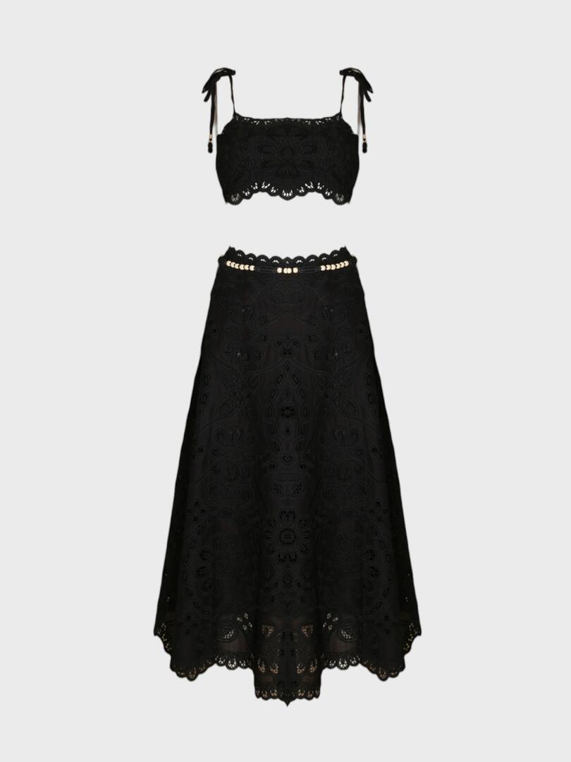 Костюм Zimmermann — это элегантный и романтичный комплект из двух предметов, выполненный в черном цвете с использованием тонкой вышивки и кружевной отделки. Модель сочетает в себе женственность и этнический шарм, что характерно для стиля бренда. 100% хлопок Откройте для себя мир элегантности и утончённости с коллекциями Zimmermann. Каждое изделие бренда — это воплощение женственности и стиля. Изысканные ткани, романтичные принты и идеальная посадка делают вещи Zimmermann идеальными для тех, кто ценит красоту и комфорт. Будь то летний комплект, вечернее платье или стильный купальник — продукция Zimmermann подчеркнёт вашу индивидуальность и создаст неповторимый образ на любой случай.